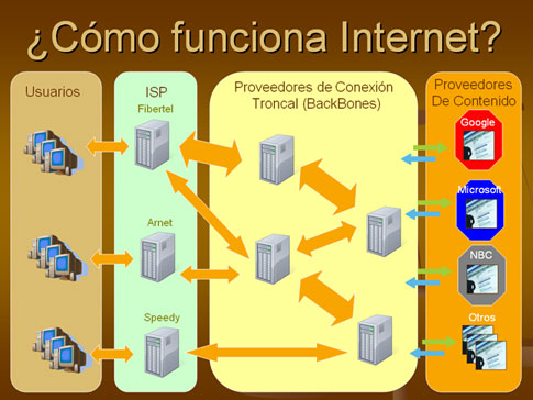 ¿Qué implica la “Igualdad en la Red”? Para comprender acabadamente dicho concepto, debemos primero explicar en forma sencilla pero precisa cómo funciona Internet. Internet puede ser explicada como una autopista con muchos carriles, a través de los cuales circula la información. La cantidad de carriles que posee la autopista está definido por el denominado "ancho de banda". A mayor ancho de banda, es decir, a mayor cantidad de carriles, más rápido llega la información de un lugar a otro. Internet esta compuesta por la interconexión de autopistas (autopistas de información), algunas con más carriles, y otras con menos carriles; para llegar al usuario final con una autopista que contrata con su proveedor de Iternet (ISP, por sus siglas en inglés), que en Argentina pueden ser, por ejemplo, Fibertel, Telecentro, Arnet, Speedy, y otros. Estos ISP proveen un “ancho de banda” entre el usuario y ellos; pero la información pasa por varias autopistas en su viaje desde el origen (los Proveedores de Contenido, como Google, Yahoo, Youtube, Microsoft, etc.) hasta el usuario final. A modo de ejemplo, imaginemos que una persona debe viajar desde la ciudad de Córdoba hasta la ciudad de Buenos Aires. Es probable que utilice las rutas y autopistas más directas, pero puede ser que dichas autopistas estén congestionadas en diferentes tramos, lo cual lo demorará. Claramente el último tramo (la autopista Panamericana) es una vía con muchos carriles (de hecho, la más ancha de todas) pero la demora se producirá en las autopistas y rutas anteriores, por lo cual sin importar el último tramo, el viaje será demorado por los tramos anteriores. El siguiente esquema explica sencillamente el funcionamiento de Internet, donde el ancho de las flechas indica (a modo de ejemplo, no está basado en datos reales) los diversos “Ancho de Banda” que existen entre los diferentes servidores por los que viaja la información antes de llegar al usuario final.