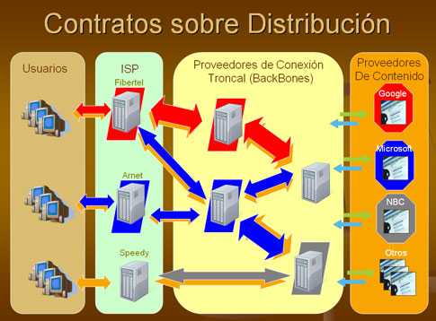 Recientemente, grandes empresas Proveedoras de Contenidos han intentado contratar con quienes proveen servicios de Internet (ISP), la exclusividad de carriles, para que sus productos llegasen más rápido al usuario. Eso impactaría necesariamente en desmedro del resto de la información, que tendría que -utilizando el ejemplo de la autopista anteriormente enunciado- transitar "por colectora". Continuando con el ejemplo anterior, si algunos Proveedores de Contenido contrataran anchos de bandas en los diversos servidores, el tráfico del resto de los Proveedores de Contenido se vería perjudicado, llegando incluso a resultar tan lento el acceso a ellos por parte del usuario, que en la práctica sería como si no existiese. El siguiente esquema explica cómo se vería afectado el acho de banda si los proveedores de contenido del ejemplo anterior contratasen (siempre a modo de ejemplo, sin basarnos en datos reales) carriles propios en las conexiones. Cada color corresponde a un Proveedor de Contenido, dejando el poco espacio libre (color naranja) para el resto del tráfico de Internet: